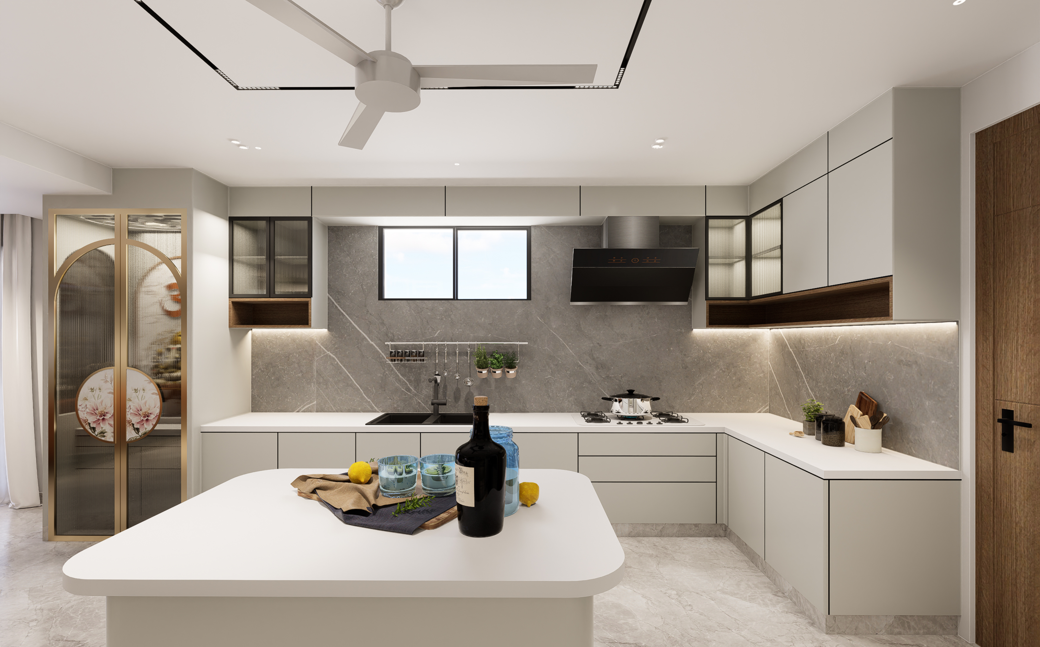 The sweet spot for most Hyderabad homes - functional yet social. Creates natural separation between cooking and dining areas while keeping conversations flowing during meal prep.